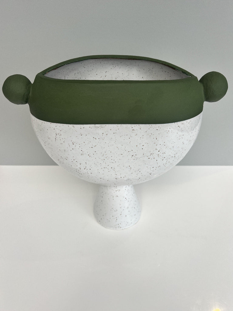A limited-edition design, the Ball Vase balances playfulness with refinement. The vessel’s rounded form is crowned in a soft matte olive green glaze, while the body is finished in a glossy white speckled glaze that catches the light beautifully. The interior is fully coated in a white glaze, making it completely waterproof and ready to hold fresh blooms.