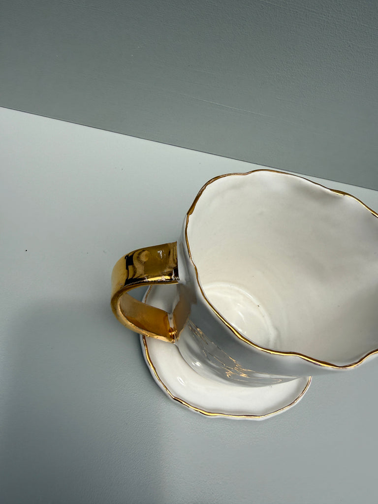 A delicate white ceramic jug and saucer decorated with candle 18 carat gold ball.