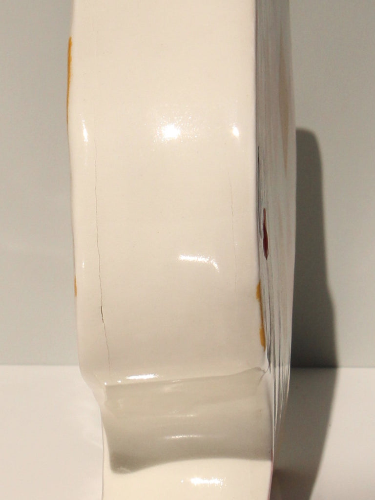 This large vessel has been hand built and painted by artist Susan Christie in a pink and mustard diamond pattern. The pattern is on the front and back of the vessel. The sides are left white. Clear glaze has been applied inside and outside the vessel.